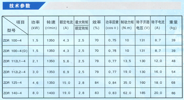 ZDR系列電動(dòng)機(jī)采用380V電源,50Hz,基本工作制為S4,負(fù)載持續(xù)率25%,等效起動(dòng)次數(shù)120次/小時(shí)。