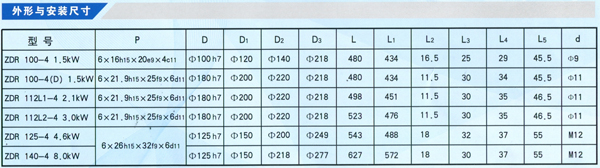 ZDR系列電動(dòng)機(jī)為封閉式結(jié)構(gòu),防護(hù)等級(jí)為IP44,冷卻方式為自冷式IC0141,絕緣等級(jí)有B級(jí)和F級(jí)兩種。