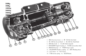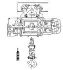 CD1型電動葫蘆主要結構:減速器,運行機構,卷筒裝置,吊鉤裝置,聯軸器,軟纜電流引入 器,限位器.電機采用錐形轉子電動機,集動力與制動力于一體.
