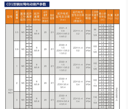 CD1型電動葫蘆起升高度: 6m、9m、12m、18m、24m、30m